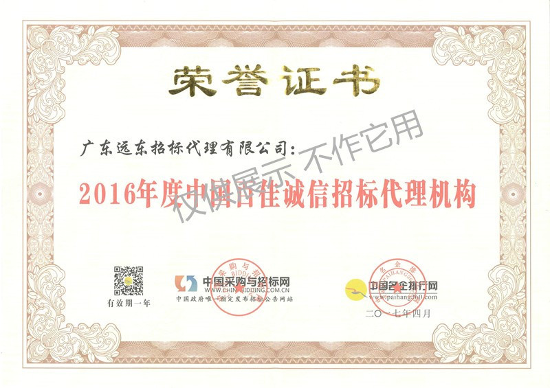 2016年度中國(guó)百佳誠(chéng)信招標(biāo)代理機(jī)構(gòu)